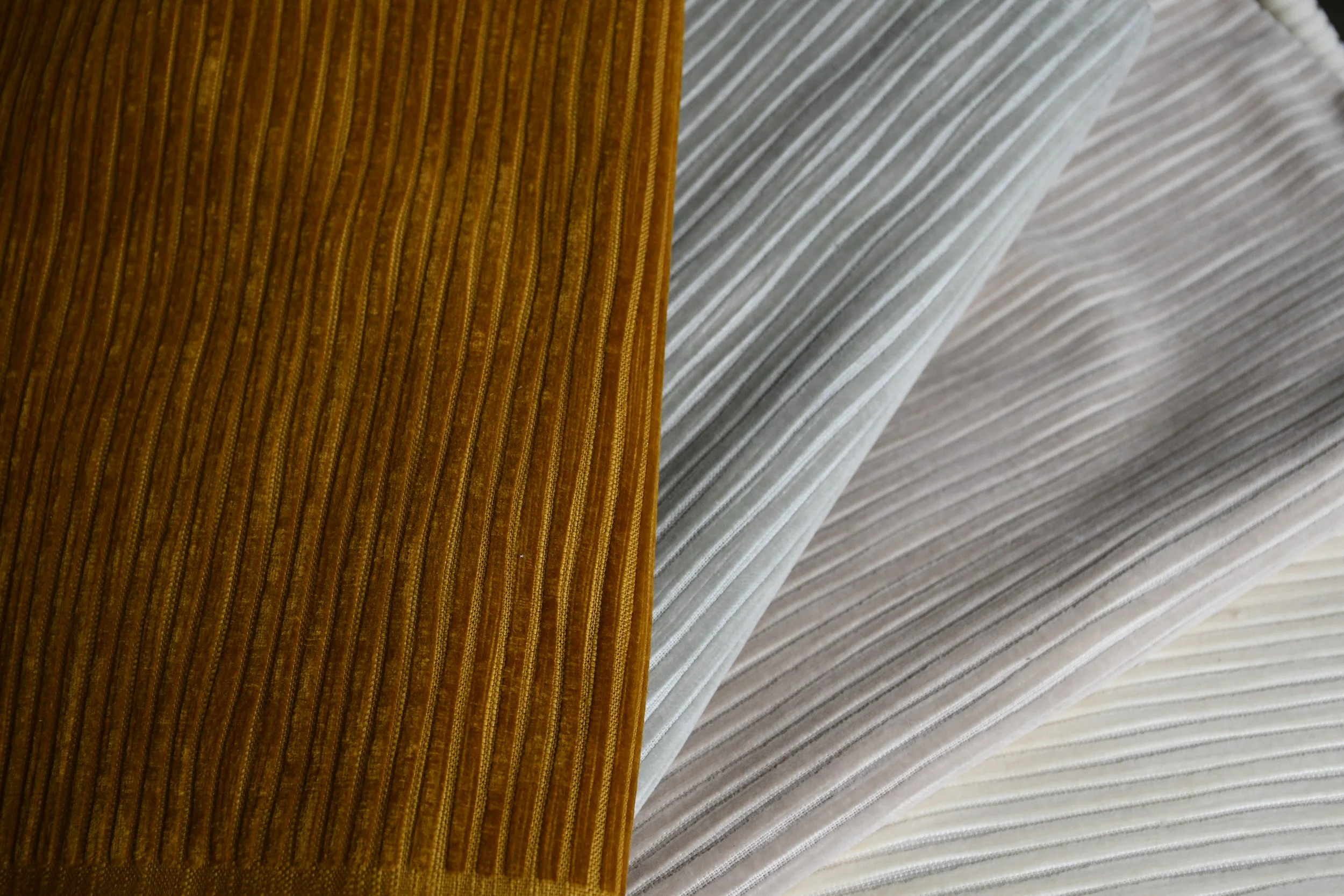 A low pile cotton velvet is always a feast for the eyes as well as deliciously  soft to the touch – but our new range of Textured Velvets go above and beyond.  They take cotton velvet into the realm of a luxury fabric. The Sculpted Velvet has a lovely, randomly carved surface, and the Corduroy adds a more overt texture to the fabric.